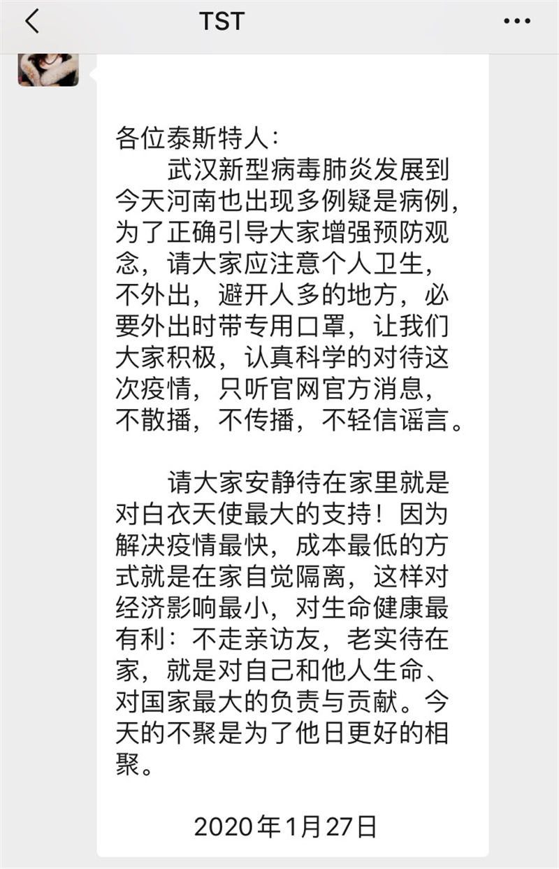 面向全體員工發(fā)布“告全體泰斯特人書”,統(tǒng)一全員思想,對(duì)抗疫情。