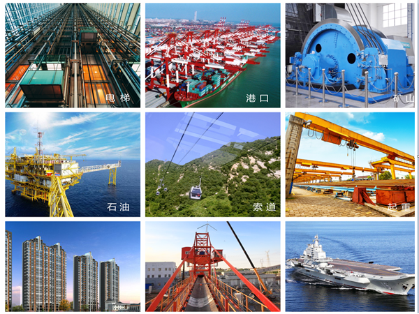 產(chǎn)品廣泛應(yīng)用于電梯、礦山、港口、石油、索道、電力、冶金、起重機(jī)械、船舶、工業(yè)、斜拉橋及軍事等領(lǐng)域。在國內(nèi)市場(chǎng)具有高份額的市場(chǎng)占有率,在國際市場(chǎng)遠(yuǎn)銷多個(gè)國家。