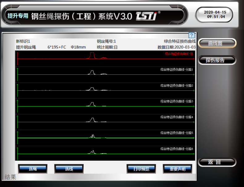 在系統(tǒng)軟件中可查看實(shí)時(shí)探傷曲線,探傷數(shù)據(jù)報(bào)表實(shí)時(shí)了解鋼絲繩損傷狀況,記錄鋼絲繩隨時(shí)間變化的損傷狀態(tài)(趨勢(shì))。系統(tǒng)增加智能化AI統(tǒng)計(jì)算法,有效的剔除異常雜點(diǎn),使探傷數(shù)據(jù)準(zhǔn)確可靠,重復(fù)性好。同時(shí)增加無(wú)標(biāo)定算法,可有效解決設(shè)備溫度引起的漂移和檢測(cè)方向干擾問(wèn)題。