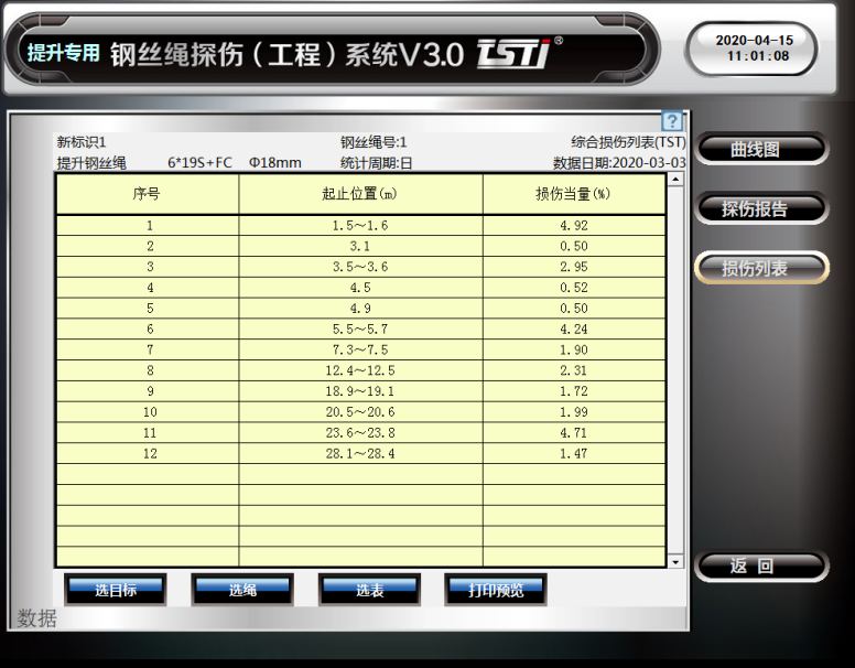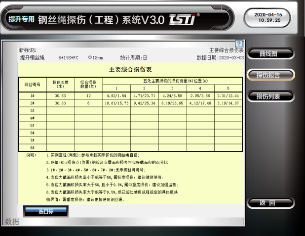 還可自動(dòng)生成鋼絲繩探傷報(bào)告和損傷列表,對(duì)鋼絲繩進(jìn)行全方位的評(píng)估。同時(shí)系統(tǒng)根據(jù)鋼絲繩損傷程度具備三級(jí)報(bào)警模式,有效的守護(hù)鋼絲繩安全。