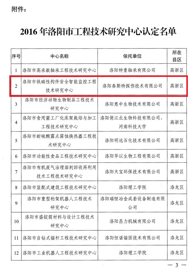 根據(jù)《洛陽市工程技術(shù)研究中心管理辦法》(洛市科【2006】95號)規(guī)定,經(jīng)組織申報、初審、現(xiàn)場考察、會議評審等評審程序,洛陽泰斯探傷技術(shù)有限公司被認定為洛陽市鐵磁性構(gòu)件安智能監(jiān)控工程技術(shù)研究中心。